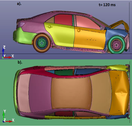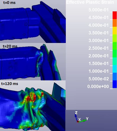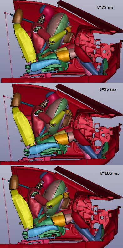 Badania dynamiczne przeprowadza się, aby zbadać odpowiedź układu na zmienne w czasie obciążenie. Uwzględnia się tu efekty dynamiczne oddziaływujące na badany układ, m.in. siły bezwładności, np. podczas zderzeń. Dzięki przeprowadzeniu symulacji, np. zderzenia pojazdu jesteśmy w stanie oszacować prawdopodobieństwo wystąpienia poważnych obrażeń w ciele człowieka lub też zbadać właściwości energochłonne pojazdu. W analizach dynamicznych uwzględniamy wszystkie rodzaje nieliniowości – nieliniowość materiałową, geometryczną (duże odkształcenia) oraz modelujemy zagadnienia kontaktowe. Zrealizowane symulacje zderzeń przedstawiono poniżej.