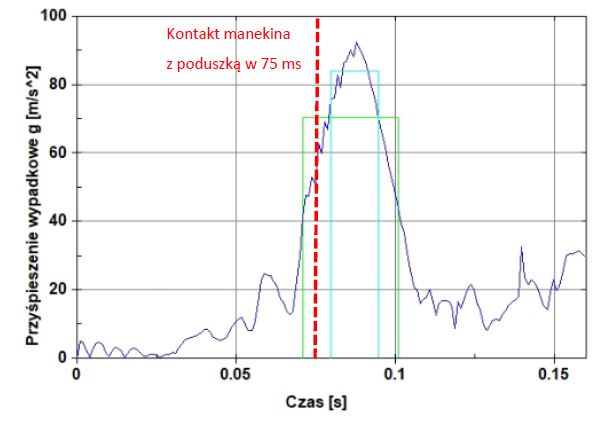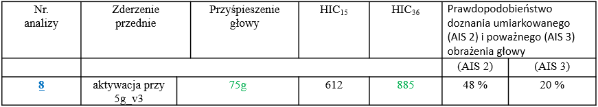 Przyśpieszenie wypadkowe głowy amax= 75 g, hic15=612, hic36=885