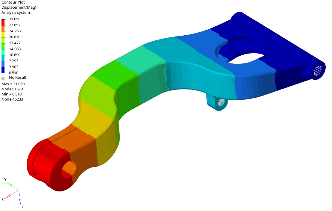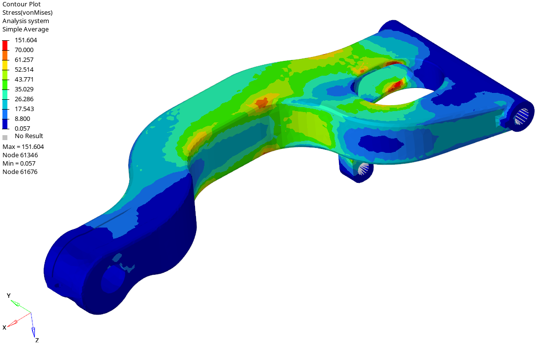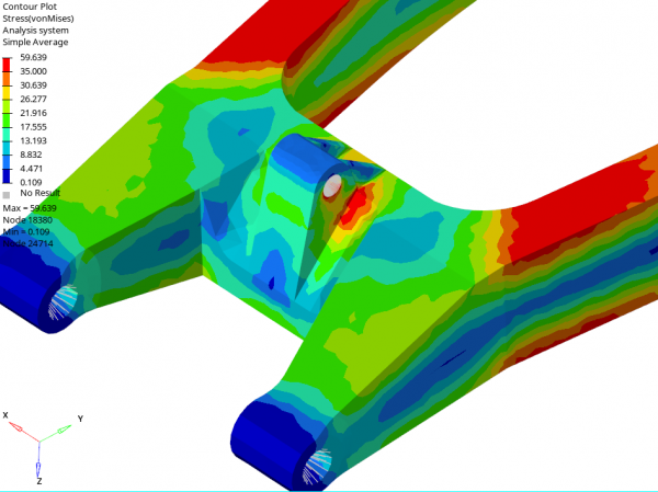 jak również wartości przemieszczeń oraz odkształceń. Już na etapie projektowania możemy zmodyfikować geometrię tak, aby spełniała założenia konstrukcyjne. Przeprowadzamy analizy statyczne liniowe oraz nieliniowe. Uwzględniamy wszystkie rodzaje nieliniowości – nieliniowość materiałową, geometryczną (duże odkształcenia) oraz modelujemy zagadnienia kontaktowe. Zrealizowane obliczenia statyczne wahacza motocyklowego przedstawiono poniżej.